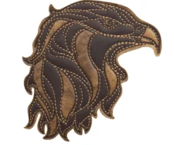 The rugged, tan vinyl exterior invokes the rich warmth of leather. The left pocket shows the American flag, printed in somber gray, while the right displays an eagle, overlooking the Outlaw logo. Both are rendered in a style reminiscent of leather punch design.