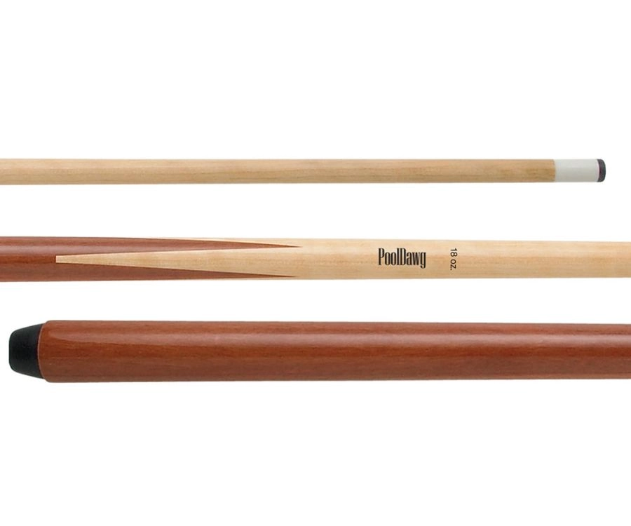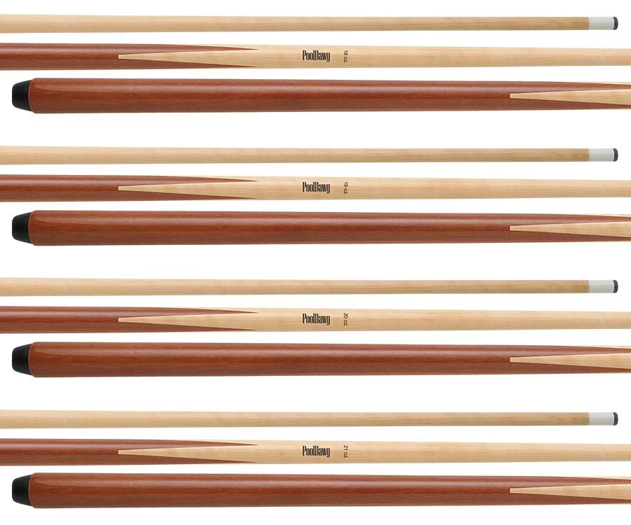 Buy a bundle, save a bundle! The Pooldawg One Piece 57-inch house pool cue is made with Russian maple. This cue utilizes a fiber ferrule, a 13mm tip and pro taper. This bundle includes 1 18oz, 1 19oz, 1 20oz and 1 21oz cue. Perfect for any game room.