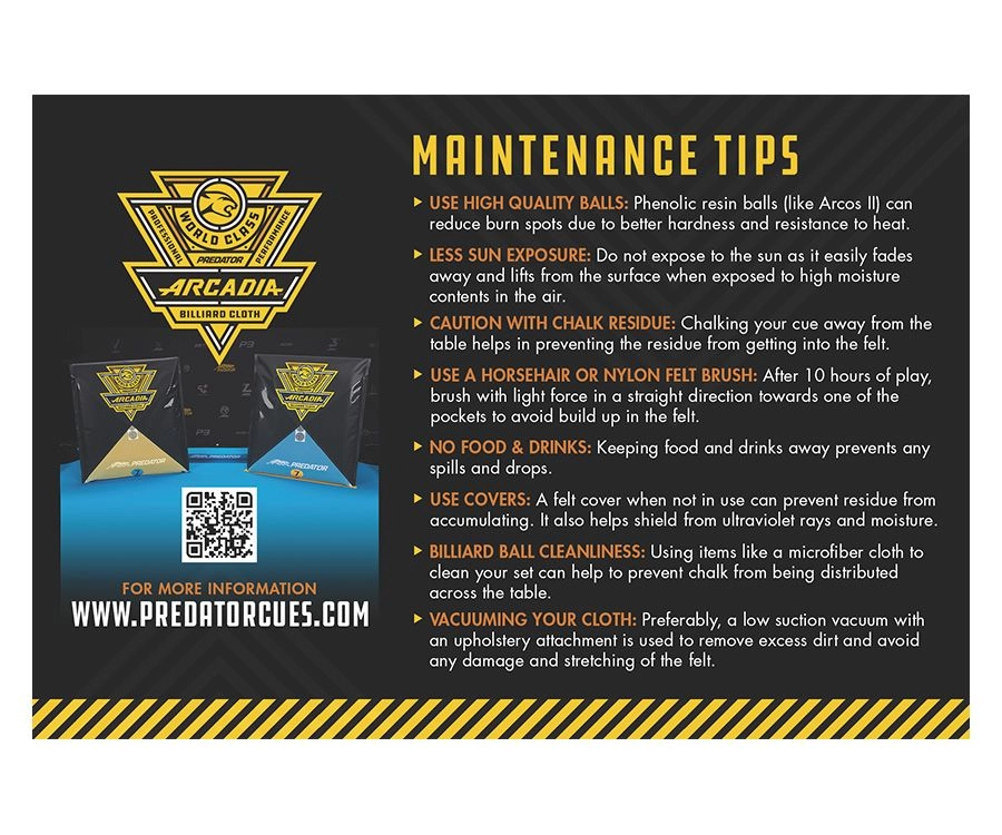 The Predator Arcadia Reserve pool table cloth is THE premium worsted cloth, engineered to be the most consistent and durable cloth on the market while maintaining great speed and action. Arcadia Reserve is only available in Tournament Blue. Arcadia Reserve is the most durable and highest-performance cloth choice for both commercial and home settings. Cloth is delivered with pre-cut rails, featuring the unique Predator rail logo!
